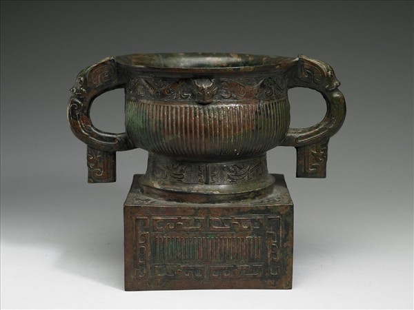 侈口,折沿,束頸,鼓腹,腹兩側為獸首半環耳,帶垂珥,圈足起臺,下接方座。頸飾浮雕雙身龍紋,龍身以連續的盾紋呈現鱗片效果。腹壁飾直棱紋,圈足飾長尾小鳥紋,地填雲雷紋。兩長方形珥為獸首銜鳥造型。方座臺面四角飾牛首紋,四側面以竊曲紋作方欄,內排直棱紋,與器腹紋飾呼應。銅簋下配方座,源自銅禁作為酒器專屬臺座的概念,盛行於西周早期的陝西寶雞地區,並由此向四周影響。