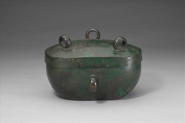 器身略方,附平頂蓋,環耳,平底,近一耳處有傷殘。蓋飾環耳,外底似有鑄造痕跡。