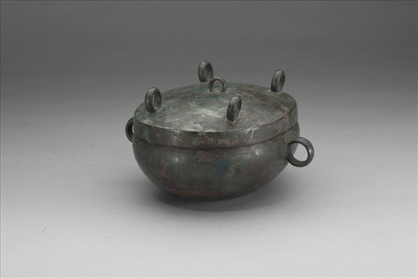 附平頂蓋,圓腹,環耳,平底。蓋飾環耳,蓋沿傷殘。