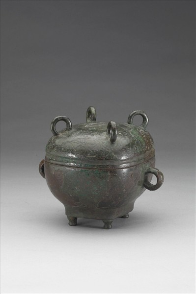 附蓋𨨛,器形略方,平頂蓋,環耳,平底,底側出四足,蓋附環耳。蓋、腹均飾幾何紋。