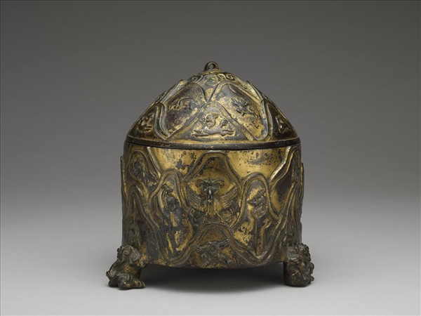 「樽」是漢代主要的盛酒器,基本上分成盆形和筩形兩大類,此件即筩形樽。周身裝飾層層山巒,山間布滿形形色色的奇禽異獸,有的奔馳跳躍,有的攀爬於山腰,有的站立山巔遠眺,造形可掬;又有肩生雙翼的羽人在山中修煉,是漢代常見的神仙人物。器底三隻獸足也是形態各異,似熊似虎,頗得自然生動之趣。