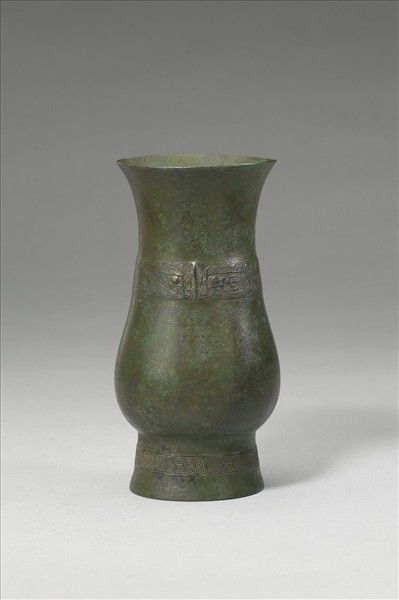 侈口,鼓腹,圈足。頸飾獸面紋,以雷紋為地,足飾雲雷紋。