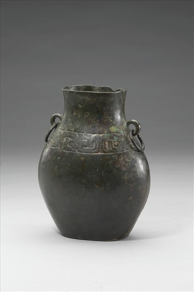 鈚,腹橫剖面呈橢圓形,侈口,環耳附環,鼓腹,平底。腹飾竊曲紋。頸一側有銘數行。