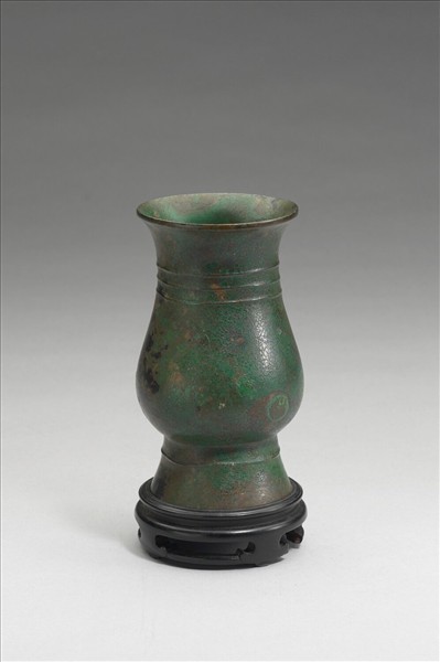侈口,縮頸,鼓腹,圈足,附木座。頸、足飾弦紋。