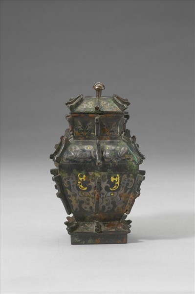 附蓋鈁,子母蓋,直口,斜肩,直腹下縮,圈足,全器有棱脊,附木座。全器嵌金銀,蓋飾鳥紋,口飾蕉葉紋,肩飾鳥紋,腹飾獸面紋,足飾幾何紋。
