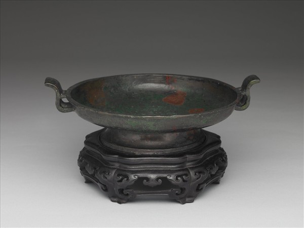 此器為「吉笵流輝」銅器匣所儲銅器中的一件。淺腹,口沿外侈,雙附耳外卷,附耳與口沿之間有支柱連結。腹下接圈足,底部作階狀。全器樸素無紋,依形制特徵,應為東周時期器物。器表有明清時期後加的綠色假鏽。附木座,上有「周素盤」及「乾隆御鑑 甲」款。 圖冊作「周素盤」。青銅盤為水器,最早見於商代前期。兩周時期,盤作為盛水器,多與盉、匜配套使用。考慮此器尺寸偏小,腹淺,似不適合當作盛水器,推測為東周時期的墓葬明器。清宮舊藏,原儲於紫禁城永壽宮。錄於《西清續鑑‧甲編》卷15頁8。