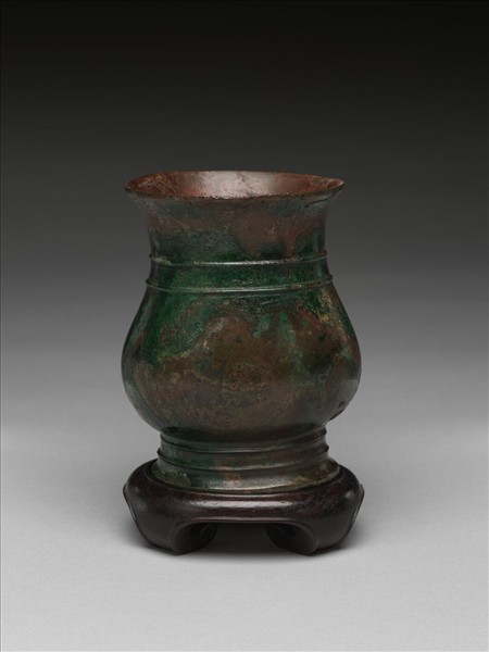 此器為「吉笵流輝」銅器匣所儲銅器中的一件。敞口,束頸,鼓腹,器身截面為橢圓形,圈足外侈。頸部及圈足上各有兩道弦紋。依形制、紋飾,應為西周早期器物。全器滿佈綠、紅相間的均勻假鏽。附木座,上有「周絃紋觶」及「乾隆御鑑 甲」款。圖冊作「周弦紋觶」。觶為飲酒器,體形短小,在西周時期的禮器組合當中,常與爵作為搭配。因銅觶的尺寸小巧,在明清賞玩的風氣下,適合作為文房擺設之用。清宮舊藏,原儲於紫禁城永壽宮。錄於《西清續鑑‧甲編》卷12頁11。