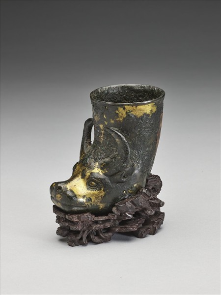 此器為「吉笵流輝」銅器匣所儲銅器中的一件。角形杯,直口,頸部有二道凸弦,杯底為具像之昂揚牛首。器表塗金,杯內及器表局部施深綠色假鏽,間以紅、綠彩。附木座,上有「唐兕觥」及「乾隆御鑑 甲」款。器上有「□字三十四(号)」殘黃簽。圖冊作「唐兕觥」。此類器物源自中亞,在唐代頗為流行。清代的鑑定者將此器定為唐代,然此器尺寸極小,為陳設所用而非實用器。較可能為明代文人所流行的小型文房古玩類器物。清宮舊藏,原儲於紫禁城永壽宮。