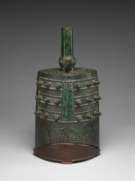 合瓦形,扁圓體,長甬,弧形口,兩面各有枚十八個。舞部飾雙龍首竊曲紋四組,區隔鉦、篆的界欄突起,枚作柱狀,鼓部正中飾左右對稱的長鼻曲體龍紋。銘文在鉦間,計二行十字,重文二字:「芮公作從鐘,子子孫孫永寶用。」此器形制及舞部、鼓部紋飾近於梁帶村二十七號墓出土編鐘。
