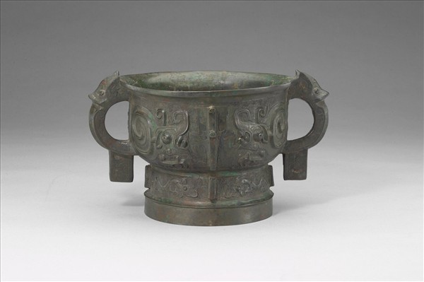 侈口,雙耳,深腹,圈足,耳作獸首形附珥,腹、足有棱脊。腹飾渦身獸紋,足飾夔紋,均以雷紋為地。