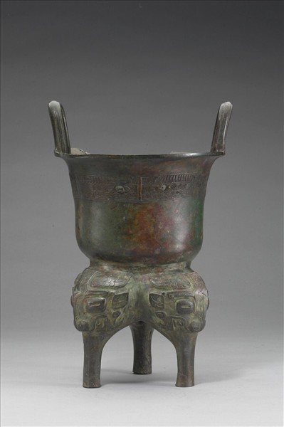 甗,甑鬲連體,侈口,立耳,深腹,分襠,柱足,甑一側口沿傷殘嚴重。頸飾獸面紋,鬲分襠飾獸面紋。口沿內有銘二字:「寶彝」。