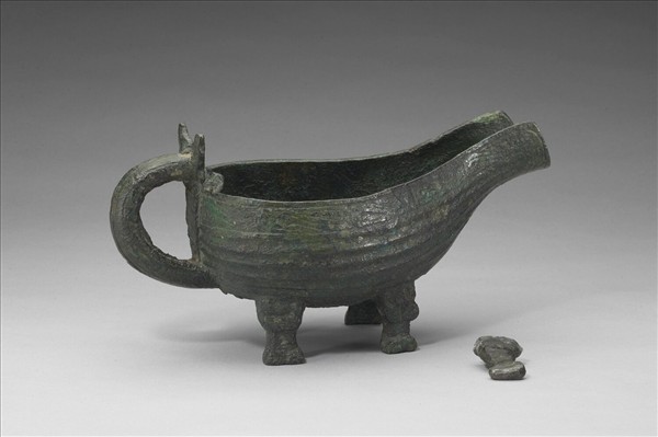 匜,呈瓢形,流部微揚,獸首鋬,四足,一足殘脫。流飾竊曲紋,腹飾瓦紋,足飾幾何紋。