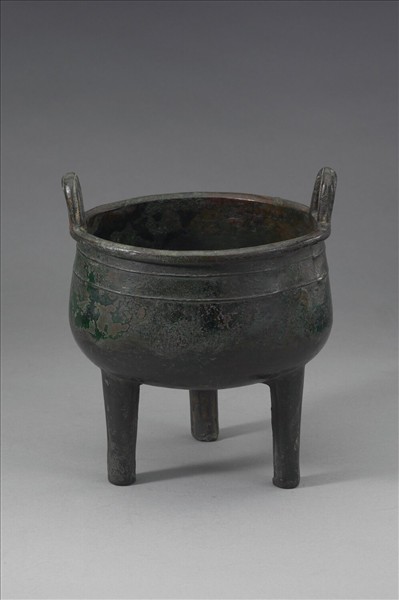 圓鼎,盤口,立耳,深腹,柱足。外底有三角紋,腹範線明顯。腹飾弦紋,耳飾綯紋。