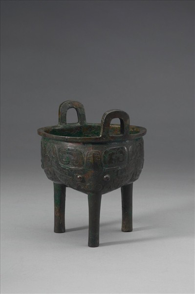圓鼎,盤口,立耳,分襠,柱足。腹飾獸面紋,以雷紋為地。
