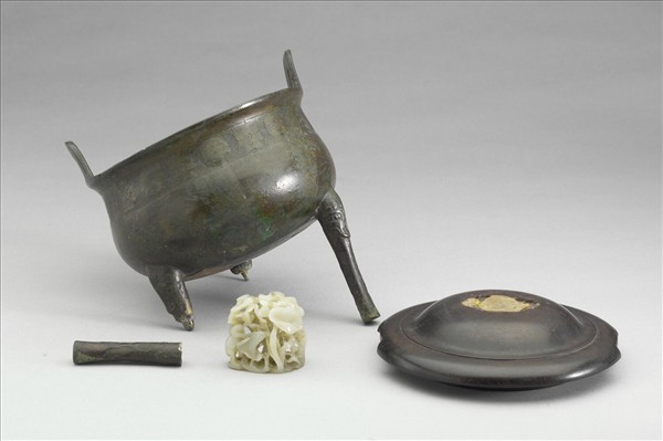 圓鼎,侈口,立耳,深腹,獸足,附玉頂木蓋,玉頂脫落,二足殘。腹飾圓渦紋、四瓣目紋,足上飾獸面紋。