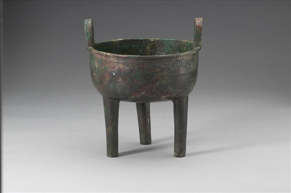 圓鼎,盤口,立耳,深腹,柱足。腹飾獸面紋。外底範線明顯。