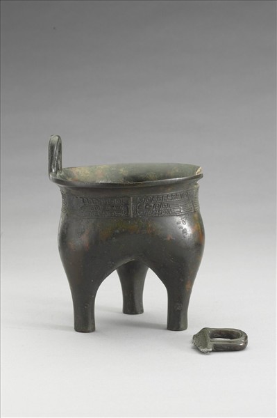 鬲,侈口,立耳,分襠,柱足,一耳殘脫。頸飾獸面紋,以雷紋為地,耳飾綯紋。