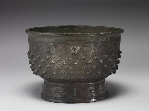 直腹圈足稍外張的無耳簋。全器紋飾滿裝分成三層:頸飾圓渦紋與四瓣目紋相間,此層主體紋飾呈淺浮雕寬面,餘為淺浮雕雷紋襯底,為主體紋飾與雷紋浮雕面等高的風格。頸飾乳丁斜方格紋,除高突的乳丁之外,斜方格紋為寬帶淺浮雕。圈足則飾寬帶浮雕夔紋,並有圈帶紋為邊飾。