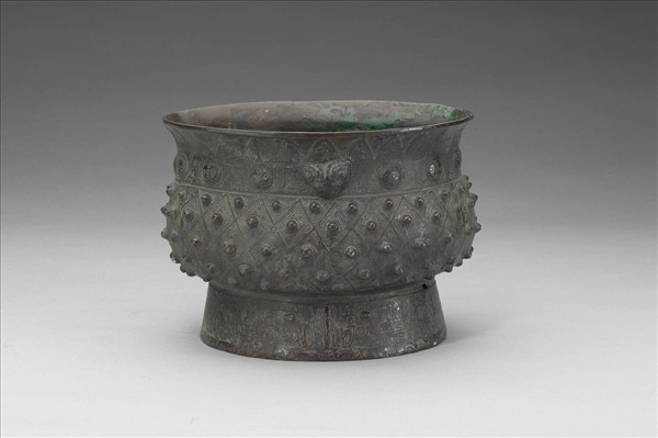 侈口,束頸,鼓腹,圜底,圈足外撇。口沿下為一周三角形雲紋,頸部飾浮雕獸首,間隔圓渦紋與填地的目夔紋,腹部飾菱格乳丁紋,內填雷紋。乳丁圓頓,突起高度約0.3至0.4公分。圈足飾相背的回首夔鳳紋,正中以短稜為鼻,左右對稱的浮凸雙目構成獸面。圈足上可見鑄造遺痕,為三鏤孔,其中兩個未穿透。此器形制、紋飾與安陽郭家莊出土銅簋(M26:26)相似,為殷墟二期器物。簋類器基本形制為鼓腹、圈足,流行年代為商代晚期至西周晚期,其間的外貌變化和區域風格主要表現在耳部和足部。