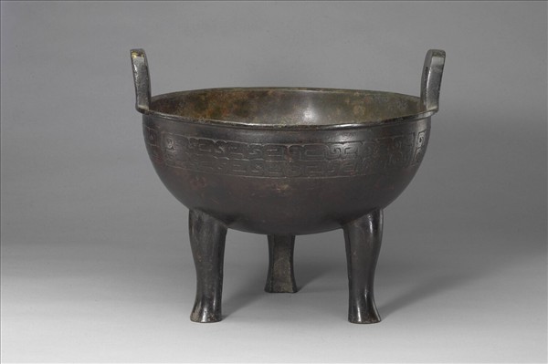 圓鼎,盤口,立耳,蹄足。頸飾竊曲紋。