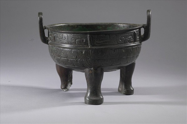 圓鼎,盤口,雙耳,蹄足,頸有棱脊,一足殘。頸飾竊曲紋,腹飾垂鱗紋。外底有三角紋。