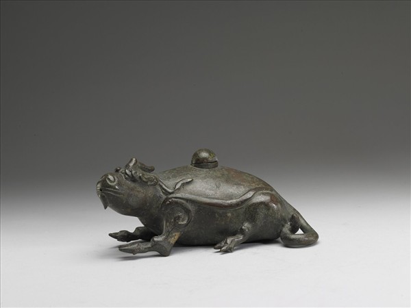 文房用具中的硯滴,是將水滴入硯台的一種工具,《長物志》認為古銅或玉做的辟邪、蟾蜍等動物為最適合。此異獸硯滴,蹲坐的異獸有獨角、偶蹄,背上有注水處,口部則有出水孔。將之置於桌案,其姿態雍容不迫,彷彿看著寫字作畫的文人,是極俱動態且精好的文房用具。
