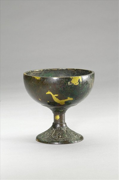 薰爐,腹呈半球體、高足。腹鎏金,腹下飾花瓣紋、幾何紋,足飾山形紋,山內間飾動物。