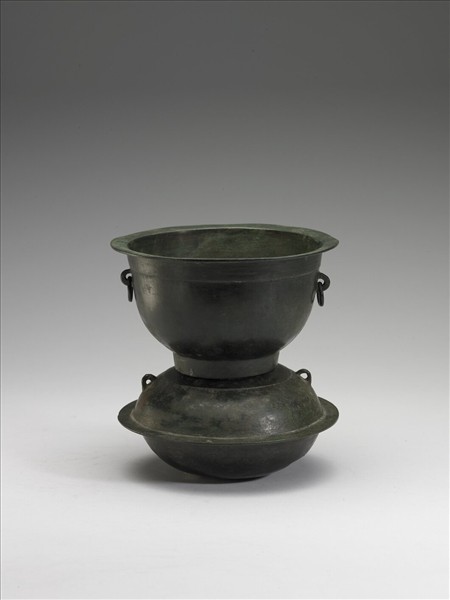 此器上為甑,下為鍑。甑,盤口、折沿,圓腹、圈足,兩側有成對環耳,便於提取移動,腹上飾弦紋一周。鍑,小口、溜肩、圓腹,圜底,肩上飾弦紋一道,肩側有二向上鉤環,腹部則有寬沿突出。鍑甑為烹煮器,圜底的鍑可直接放置於灶上受火,而甑之器底應有穿孔或鏤空箅,以便蒸氣穿透,其設計原理似今日蒸籠。1968年河北滿城西漢中山靖王劉勝夫婦墓、1981年陝西咸陽茂陵一號無名冢一號從葬坑中均出現類似的器物,全器自銘為「甗」或「甗甑」。