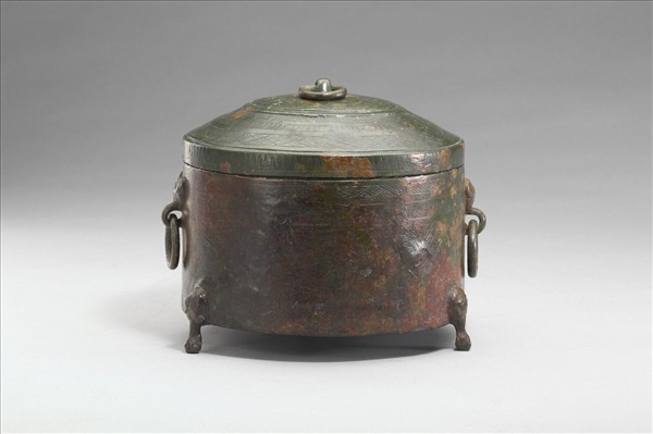 附蓋奩,平頂蓋,圓口,鋪首銜環耳,直腹,平底,蹄足。蓋飾柿蒂紋、幾何紋,腹飾幾何紋,紋飾均為陰刻線。
