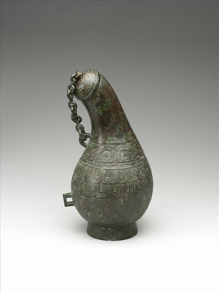 此器長側頸,口部凹弧,下腹鼓,圈足微外撇,通體似瓠。蓋以環鍊與器身上腹部之圓環相連。下腹有一突出方環。器蓋飾蟠龍紋。頸部光素無紋。器腹飾一周竊曲紋,下為四層垂麟紋。