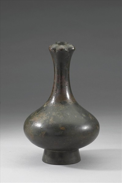 蒜頭圓口,長頸微縮,鼓腹,圈足。