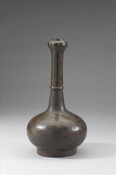 蒜頭瓶,蒜頭圓口、長頸、鼓腹、圈足。頸中央略下有一弦紋。外底有突起。