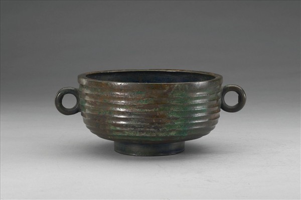 敦,盤口,環耳,圈足。腹飾瓦紋。
