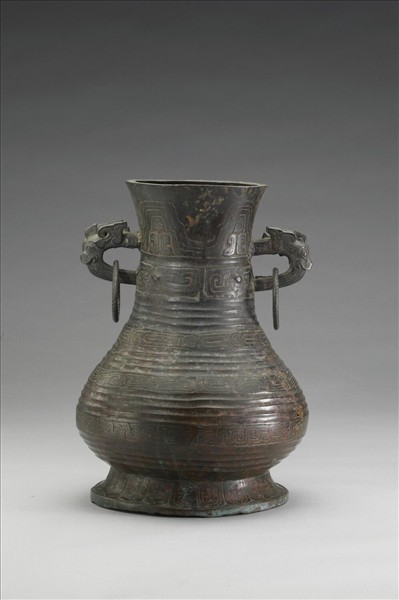 圓壼,侈口,獸首耳附環,鼓腹,圈足。頸飾波帶紋、竊曲紋,腹飾瓦紋、重環紋、幾何紋,足飾垂鱗紋,耳附環飾以綯紋。