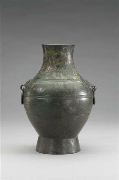口微侈,束頸,鼓腹,高圈足。肩部設鋪首銜環。器身上以三道弦紋為界,頸部飾大三角雲紋,器身三周、圈足一周三角雲紋紋飾帶。器外底部有片狀澆口遺痕。器形、紋飾及尺寸與安徽壽縣雙橋出土〈三角雲紋壺〉近乎一致,為典型戰國晚期楚系青銅壺樣式。湖南長沙絲茅沖也出土一件相近的〈雲紋壺〉,配有器蓋,說明此類銅壺原應配有器蓋。
