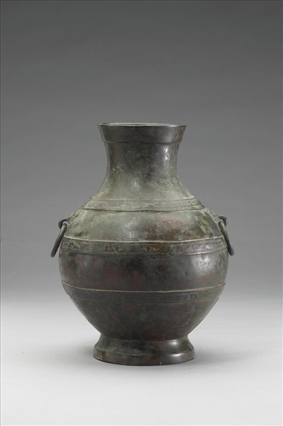 圓壼,侈口,縮頸,鋪首銜環耳,鼓腹,圈足,腹下側殘傷。腹飾帶紋,帶紋上似有鑲嵌物。