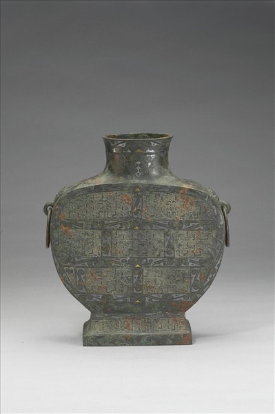 扁壺,腹縱剖面呈橢圓形,侈口,鋪首銜環耳,方形圈足。全器嵌金銀,頸飾三角紋,腹飾方格紋,方格上填雲雷紋,方格內飾幾何紋,足飾幾何紋。