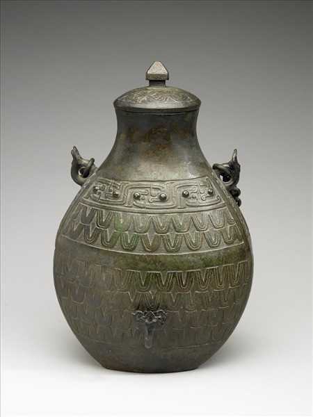 扁壺,附鈕蓋,梯形鈕,直口,短頸,斜肩,環耳,鍊形提梁,圓腹,腹下方另作一單環耳,耳作獸首形。蓋與腹飾垂鱗紋,肩上為有目竊曲紋,器身兩側則為夔紋。