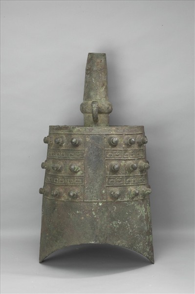 甬鐘,橢圓體,圓錐形枚,橋形口。舞部飾交蛇紋,篆部為兩頭蛇紋。