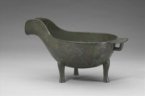 口沿下飾夔紋一道。扇形鋬上飾蟠虺紋。三蹄足。