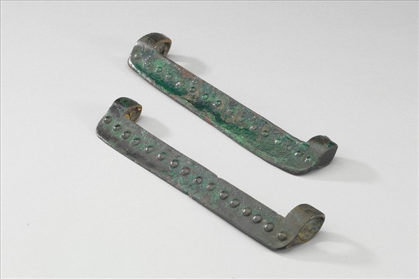 車篩,長條狀,兩側有環,器面上嵌乳丁紋。附木座,已殘。