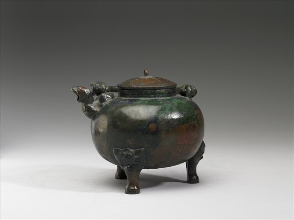 樸素無紋。流作蹲獸形,三獸首足,提梁兩端作獸首形。清宮舊藏,著錄於《西清續鑑‧甲編》卷14頁28,作「周螭梁盉二」。
