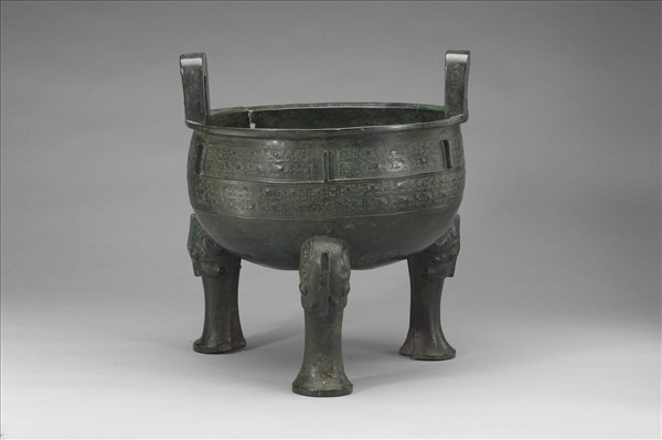 圓鼎,盤口,立耳,深腹,蹄足,腹、足有棱脊,腹有傷殘。腹飾夔紋兩圈。外底有三角紋,足內側有範線。