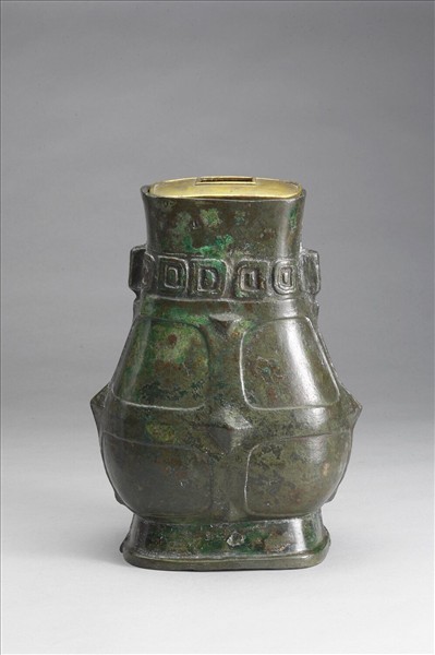 銅方壺,圓角長方口微撇,短直頸,下腹內收,方形圈足,頸兩側各有一實心耳。頸飾重環紋,頸下至足部以平行的三條寬扁帶狀紋為緯線,將器身分成二段,接著於壺的四面正中拉一條經線直下。經緯線的交接處另有巧思,設計角錐菱形紋,共十二枚。附方形金屬內膽,包黃綾,蓋上設長方孔,孔沿加厚帶棱,為明末清初內膽的特色。此壺原為酒器,後人加內膽,為以古董器皿插花的概念。