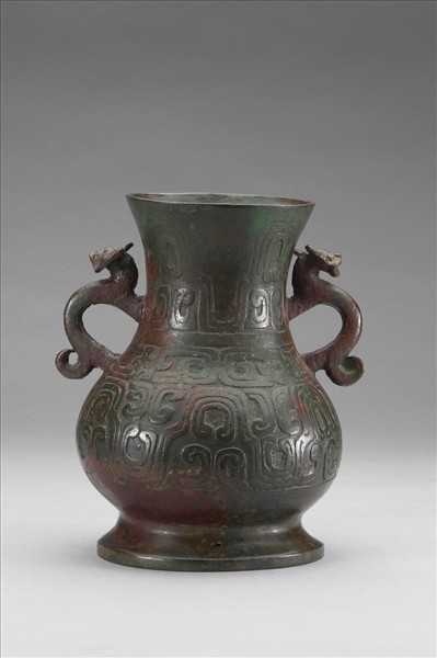 圓壼,侈口,縮頸,回首獸形耳,鼓腹,圈足。頸飾波曲紋,腹飾竊曲紋、波帶紋。