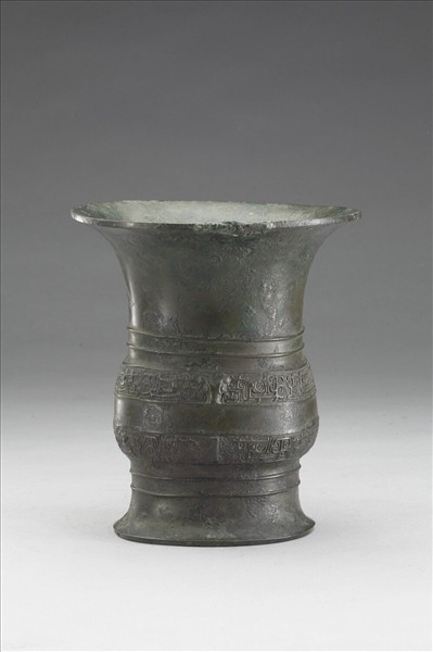 尊,撇口,圓腹,圈足外撇。器腹飾夔龍紋兩道,以雷紋為地,上下各有兩道弦紋,夔龍紋飾帶中央另飾一小獸首。器內有銘文。