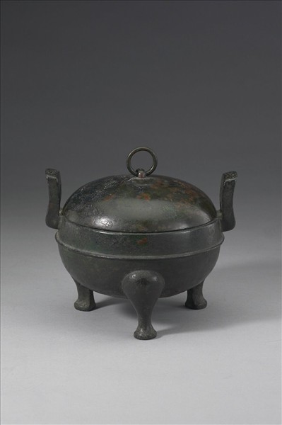 附蓋圓鼎,蓋與腹呈球體,子母口,附耳,蹄足,蓋附環耳。腹飾弦紋。蓋面環耳旁有銘,耳側似有銘。