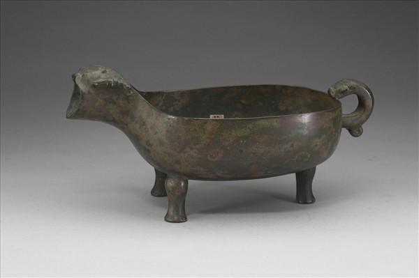 匜,呈瓢形,流作獸首微揚,獸形環耳,蹄足,一足殘脫。
