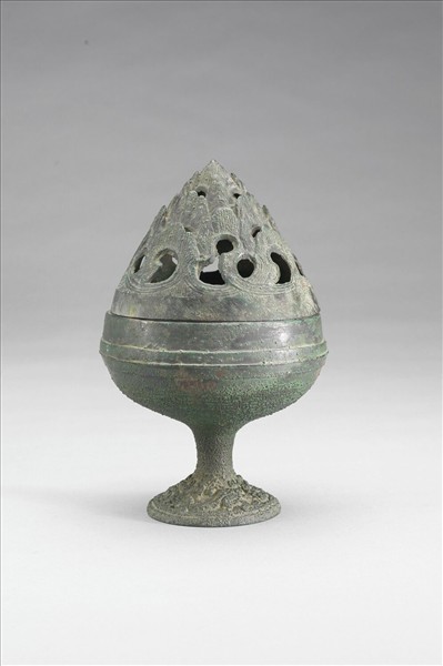 博山爐,器形如豆,附蓋,子母口,圓腹,高足,蓋呈鏤空山形。腹飾弦紋,足飾山形紋。