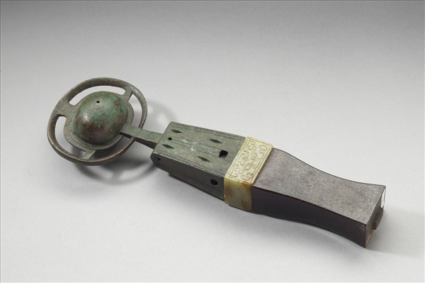 鑾,包括鈴、頸、座三部分,附玉木座。鈴為橢圓狀,內有銅丸,面為三角鏤空,週邊飾鏤空寬帶,側向一面。頸為連接鈴與座。座為上大下小方銎座,有孔。方銎座飾弦紋,附件玉飾獸面紋。